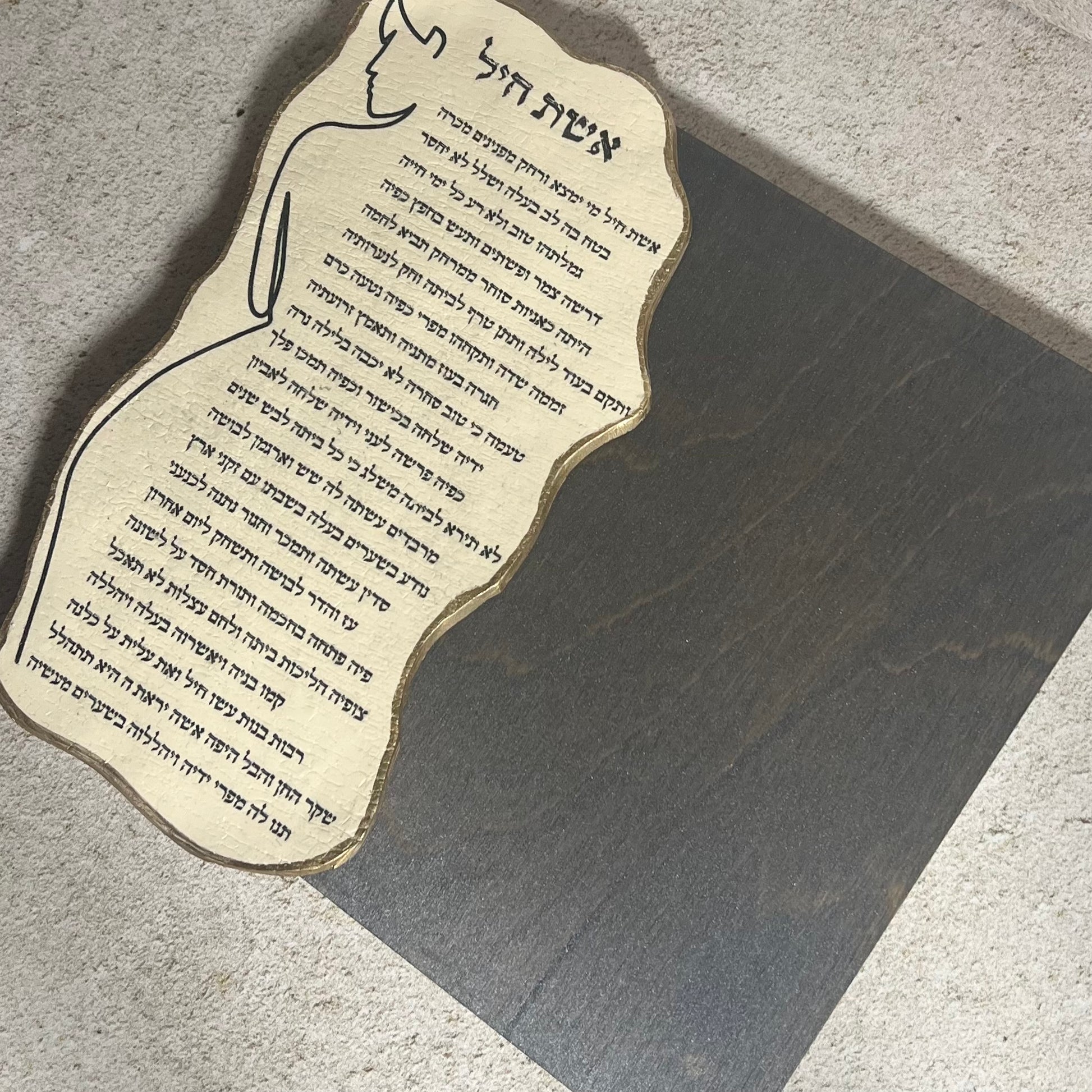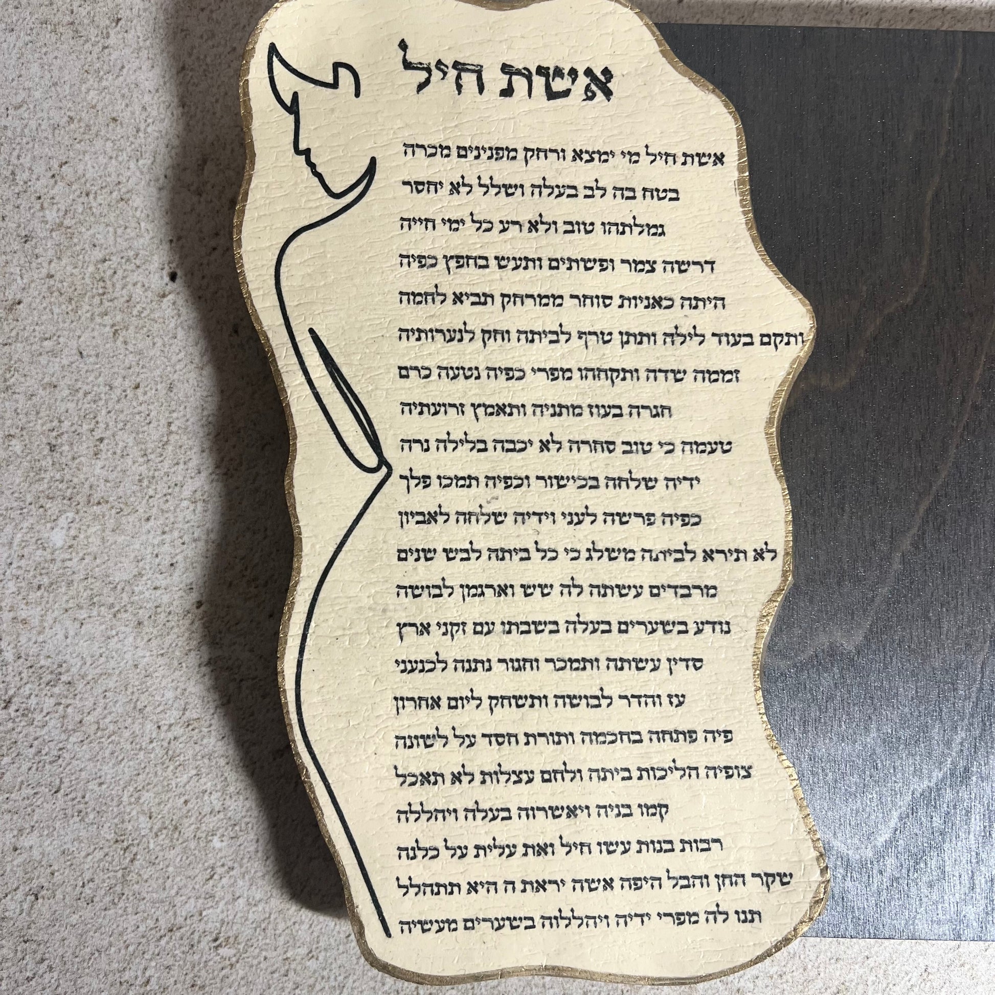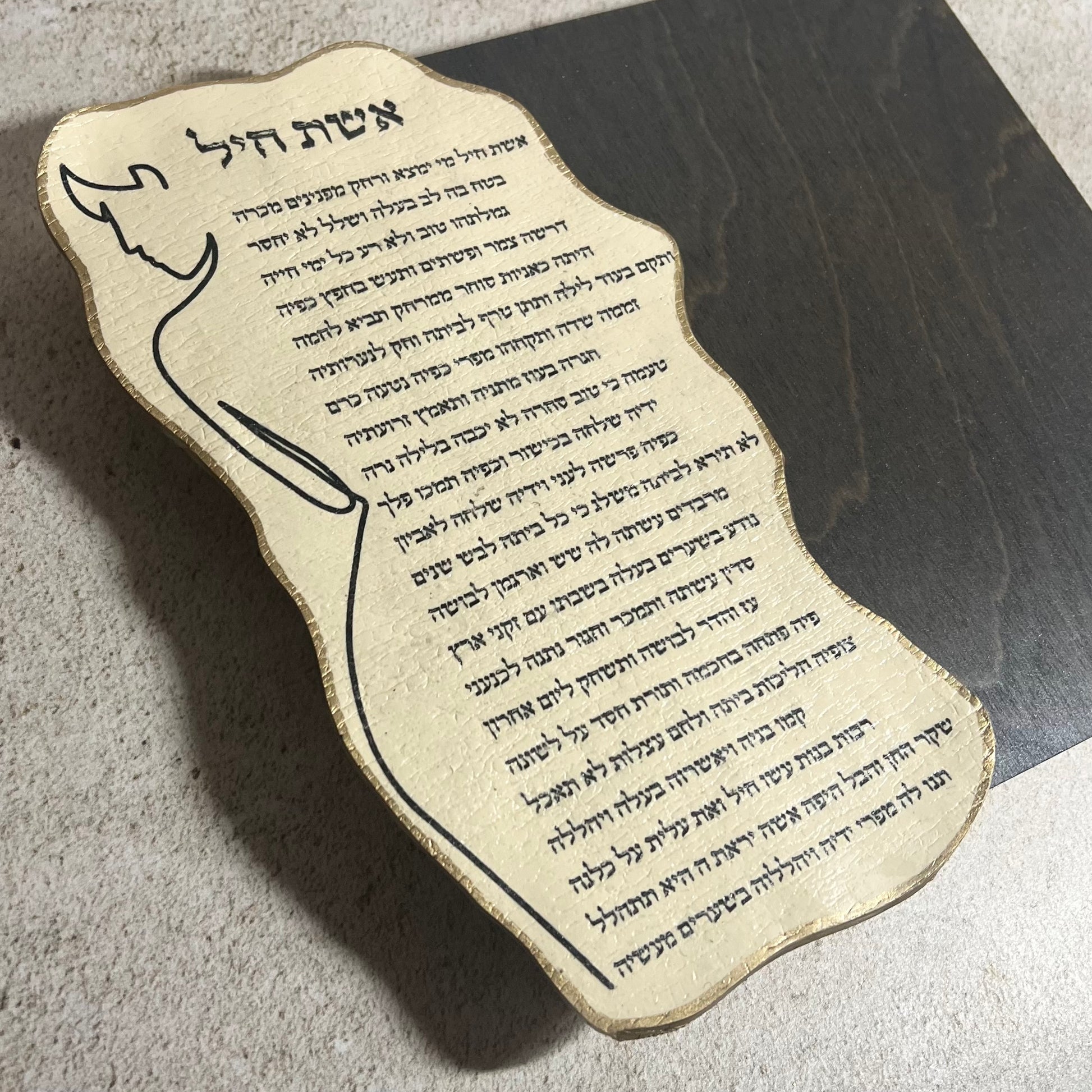 Celebrate the beauty and strength of the Jewish woman with this Eshet Chayil Wall Art. Hand-sculpted from polymer clay, this piece features a graceful female silhouette paired with the timeless words of Eshet Chayil (“A Woman of Valor”).