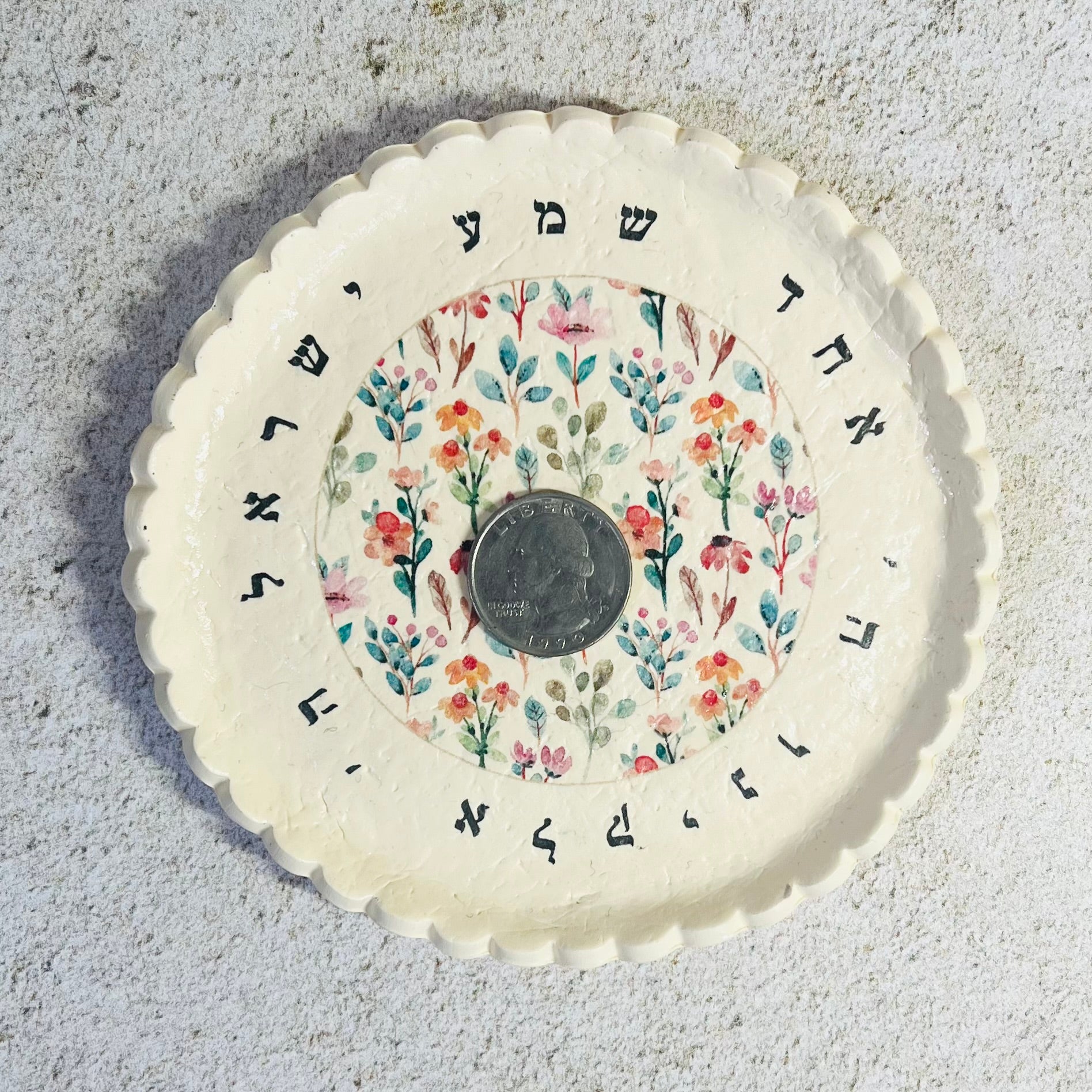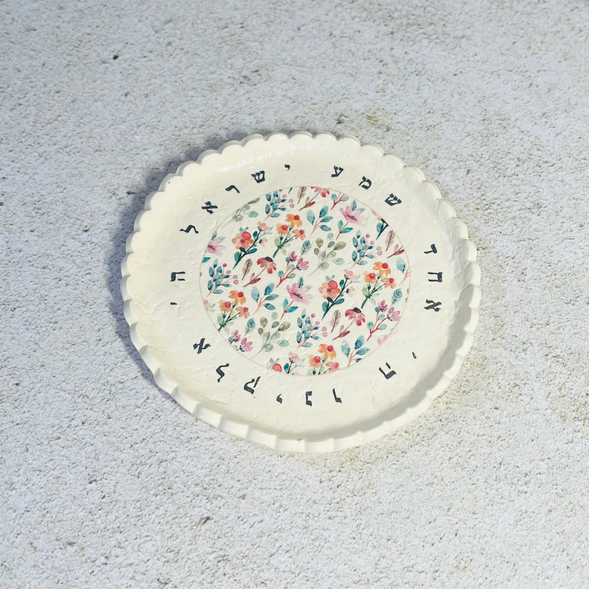 This beautiful piece brings a simple approach to a timeless prayer. Featuring a scalloped edge and floral design, this dish showcases the opening words of the Shema.